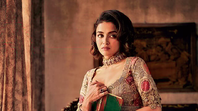 It begins with a still image in Rimple Narula’s mind: a woman alone in an artist’s studio, sunlight diffused through dusty panes, surrounded by the patina of old furniture, dog-eared books, unfinished canvases and silence. From that moment of stillness bloomed Muse in the Studio, Rimple & Harpreet’s latest campaign, a sumptuous blend of costume and couture, starring Wamiqa Gabbi in the role of a 1960s diplomat’s wife. Shot like a lost reel from a European art-house classic, the story unfolds in layered tableaux of solitude, identity, and longing. Styled by Rimple herself, Wamiqa is draped in sequinned saris that catch the light like whispered secrets, lehengas that borrow the delicacy of European lace, and hand-embroidered jackets paired with vintage Victorian accessories. Each look is an echo of another time, yet, somehow, utterly of the now.