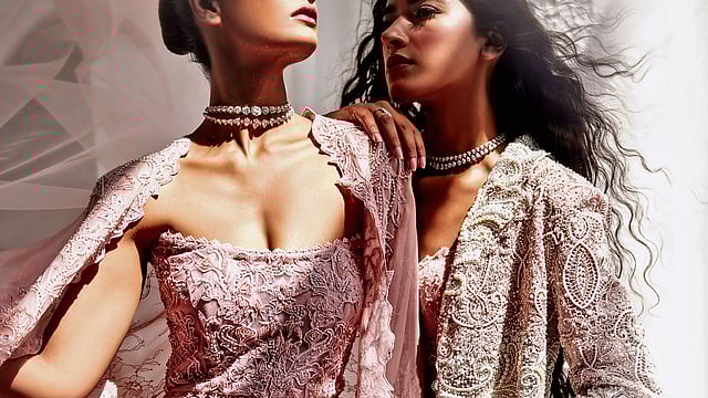 The lace is hand-cut, hand-placed, and hand-sewn. “In some garments, we use sheer layers underneath, allowing the lace to float and catch light subtly. In others, we layer larger motifs over gathers to add volume and depth,” says Jajodia. Each piece is meant to feel personal and timeless. “This collection bridges the gap between heritage and innovation,” says Jajodia.