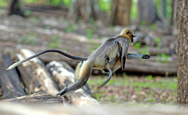 A lion-tailed macaque in Bavali forest area of Wayanad's Kerala carries its young one, as it jumps from one tree branch to another in search of food. (Photo | T P Sooraj, EPS)