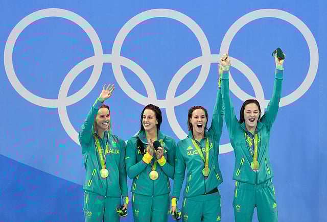 Hungary's Katinka Hosszu celebrates winning a gold medal in the women's 400-meter individual medley during the swimming competitions at the 2016 Summer Olympics, Saturday, Aug. 6, 2016, in Rio de Janeiro, Brazil. | APAustralia's Cate Campbell, Bronte Campbell, Emma McKeon and Brittany Elmslie, from left, hold their gold medals after winning the women's 4x100-meter freestyle final setting a new world record during the swimming competitions at the 2016 Summer OlympicsAustralia's Cate Campbell starts her final leg of the 4 x 100m freestyle championship final swimming competition ahead of USA's Katie Ledecky at the 2016 Summer Olympics, Saturday, Aug. 6, 2016, in Rio de Janeiro, Brazil. | APHungary's Katinka Hosszu celebrates after setting a new world record and winning the gold medal in the women's 400-meter individual medley final during the swimming competitions at the 2016 Summer Olympics, Saturday, Aug. 6, 2016, in Rio de Janeiro, BraUnited States' Kevin Cordes competes in a semifinal of the men's 100-meter breaststroke during the swimming competitions at the 2016 Summer Olympics, Saturday, Aug. 6, 2016, in Rio de Janeiro, Brazil. | APAustralia's Cate Campbell, is greeted by teammates after anchoring the team to gold in the women's 4x100-meter freestyle relay as United States' Katie Ledecky looks on during the swimming competitions at the 2016 Summer Olympics, Saturday, Aug. 6, 2016Australia's Emma McKeon, Brittany Elmslie, Bronte Campbell and Cate Campbell celebrate after winning the gold medal and setting a new world record in the women's 4x100-meter freestyle final during the swimming competitions at the 2016 Summer Olympics, S