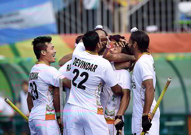 India's Kothajit celebrating with team members after scoring a goal against Argentina during the Qualifying round match at the Summer Olympic 2016 at Rio de Janeiro Brazil on Tuesday. | PTI