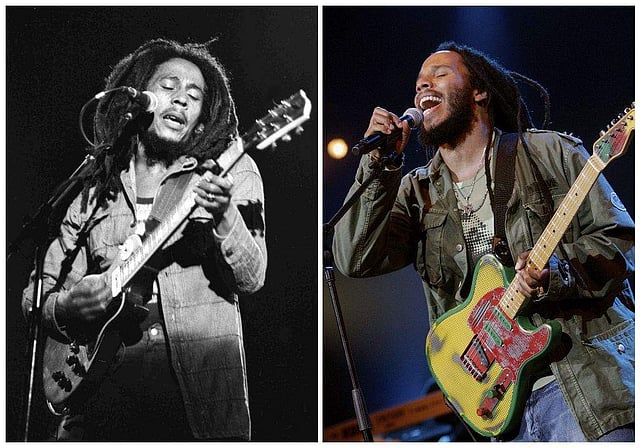 Jamaican Reggae legend Bob Marley performs at a reggae festival concert in Paris on July 4, 1980, left, and his son Ziggy Marley performs during the Paleo Festival, in Nyon, Switzerland on July 19, 2006. (Photo | AP)