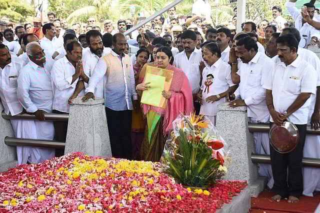 Another view of Deepa praying at jayalalitha memorial with her nomination papers on Thursday. | (Ashwin Prasath| EPS)Drummers at jayalalitha memorial on Thursday. | (Ashwin Prasath| EPS)BJP national Secretary T Raja meet AIADMK Rebel OPS candidate Madusoodanan after the later files the nomination papers for the R K Nagar constituency on Thursday in Chennai. | (Ashwin Prasath| EPS)AIADMK Rebel OPS candidate Madusoodanan meet the waiting parchment while going to file the nomination papers for the R K Nagar constituency on Thursday in Chennai. | (Ashwin Prasath| EPS)Supporters of AIADMK Rebel OPS candidate Madusoodanan at the R K Nagar constituency on Thursday in Chennai. | (Ashwin Prasath| EPS)AIADMK Rebel OPS candidate Madusoodanan files the nomination papers for the R K Nagar constituency on Thursday in Chennai. | (Ashwin Prasath| EPS)Hindu Munnani Katchi cadres bring their R K Nagar by-election candidate Ravikumar in a funeral box ridiculing political scenario at Tamil Nadu, on Thursday in Chennai. | (Ashwin Prasath| EPS)AIADMK Dy. General Secretary TTV Dinakaran files the nomination papers for the R K Nagar constituency on Thursday in Chennai. | (P Jawahar | EPS)