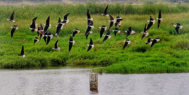 A flock of black-winged stilt flies away after stopping in Avaniyapuram, Madurai. (Photo: EPS/K.K. Sundar)