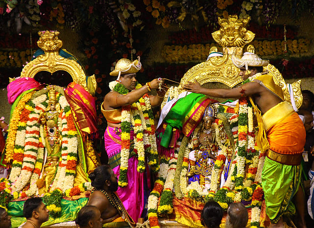 According to folklore, Meenakshi was the daughter of Pandya King Malayadwaja Pandyan. She ruled Madurai after her father and conquered many kingdoms. During one such conquests she met Lord Shiva and fell in love with him. IN PIC: The people are seen purchasing yellow threads which they would change later with their scared threads 'thali' during the wedding. (Photo: EPSK.K.Sundar)As promised to Meenakshi, Lord Shiva came to Madurai as Lord Sundareswarar to marry her after which both ruled Madurai. IN PIC: Sea of devotees throng temple venue to witness the celestial event. (Photo: EPSK.K.Sundar)The celestial wedding of Meenakshi and Lord Shiva is also called Meenakshi Thirukalyanam. (Photo: EPSK.K.Sundar)The devotees are seen watching the celestial wedding of Meenakshi and Sundareshwarar in a big LED screen fixed near Meenakshi Amman Temple at Madurai. (Photo: EPSK.K.Sundar)