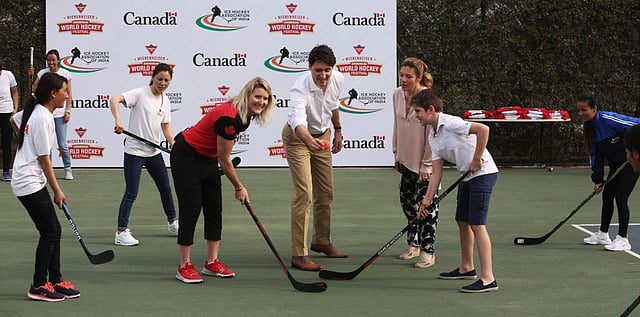 Canadian Prime Minister Justin Trudeau with his family participate in an Ice Hockey event at the Canadian High commission in New Delhi on Saturday. (Express Photo | Shekhar Yadav)