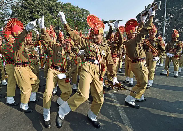A cadet of Sashastra Seema Bal during full dress rehearsal for Republic day parade in Kolkata. (Photo | AP)Soldiers carry the flags of ASEAN nations as they march past during full dress rehearsal for the 69th Republic Day Parade at Rajpath in New Delhi. (Photo | AP)An all-women team of BSF performs on motorcycles during full dress rehearsal for the 69th Republic Day Parade at Rajpath in New Delhi. (Photo | AP)An all-women team of BSF performs on motorcycles during full dress rehearsal for the 69th Republic Day Parade at Rajpath in New Delhi. (Photo | AP)Indian Air Force C-17 Globemaster III C and SU-30 planes fly past over the Parliament house during Republic Day rehearsals in New Delhi. (Photo | AP)Army tanks move past the saluting dias during full dress rehearsal for the 69th Republic Day Parade at Rajpath in New Delhi. (Photo | AP)Winners of various gallantry awards move past the saluting dias during full dress rehearsal for the 69th Republic Day Parade at Rajpath in New Delhi. (Photo | AP)