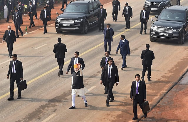 Prime Minister Narendra Modi waves at the crowd during the parade in Rajpath, New Delhi. (Photo | PTI)