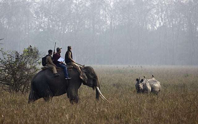 The forest officials count a horned rhinoceros from on top of an elephant during a rhino census at the Pobitora Wildlife Sanctuary in Assam. | AP