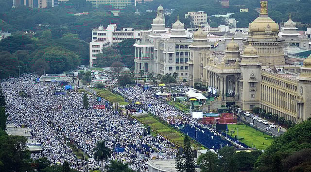 Thousands of supporters gathered out side Vidhana Soudha complex, where H D Kumaraswamy was sworn-in as the Chief Minister of Karnataka on Wednesday (Express Photo | Pandarinath B)