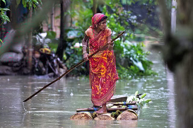 A woman rows a makeshift banana raft through flood waters in Burgaon, east of Gauhati, Assam. (Photo | AP)