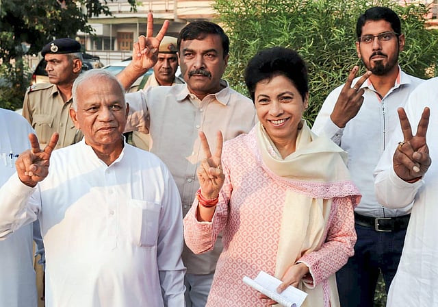 Haryana Pradesh Congress Committee (PCC) president Kumari Selja shows a victory sign after casting her vote during Haryana Assembly elections in Hisar on 21 October 2019. (Photo | PTI)