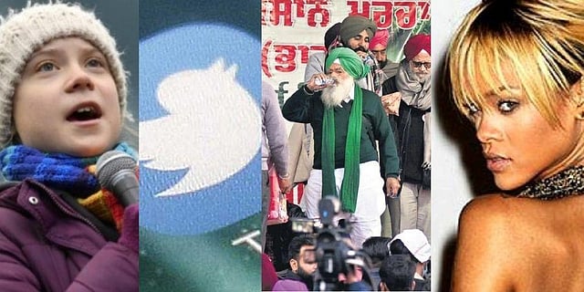 Teen climate activist Greta ThunbergSwedish teenager Greta Thunberg became the voice of conscience for a generation facing the climate change emergency. She first hit the headlines for her solo strike against global warming outside Sweden's parliament last year. Thunberg has taken her disarmingly straightforward message -- 'listen to the scientists' -- to global decision-makers, accusing them of inaction. (Photo | AP)US Congresswoman Ilhan OmarThe first Somali-American to serve in the US House, the DFL leader was an ardent critic of the immigration policies of the Trump administration. When Donald Trump tweeted that lawmakers should 'go back' to their countries if they want to criticize the US, he was referring to Omar and her fellow congresswomen Alexandria Ocasio-Cortez of New York, Rashida Tlaib of Michigan and Ayanna Pressley of Massachusetts — four freshmen women of color. (Photo| AP)American football star Juju Smith-SchusterThe 24-year-old is Pittsburgh Steelers' wide receiver and competes in the National Football League.US climate justice activist Jamie Margolin'We often take for granted where our food comes from and forget about the farmers who feed us,' she wrote in support of the farmers' movement.At age of 15 in 2017, Margolin founded the youth climate action organization Zero Hour with Nadia Nazar. The 19-year-old identifies as a lesbian and in 2018 was named as one of People Magazine's 25 Women Changing the World. (Photo | AP)Teen climate activist Jerome Foster IIJerome was selected by National Geographic to tour Iceland, where he documented the entire island in VR to show how climate change is impacting the country. Before joining the band of climate activists, the teenager was known for holding a weekly climate strike outside of the White House in the morning! (Photo | Twitter @JeromeFosterII)US writer/journalist Karen AttiahThe Global Opinions editor for The Washington Post, Karen is of Ghanian origin and was named 2019 Journalist of the Year Award by the National Association of Black Journalists for her coverage of the murder of Saudi columnist Jamal Khashoggi. (Photo |Twitter @KarenAttiah)British actor Mandy TakharThe two-time winner of PTC Punjabi Film Awards, Wolverhampton-born actor has her roots in Punjab. She debuted in 2010 release 'Ekam – Son of Soil' and was last seen in 'Yes I am Student'. (Photo | Twitter @Mandy_Takhar)Lebanese-American media personality Mia KhalifaMia Khalifa is a former adult movie actor who made a career switch to sports commentary and social media modelling. Mia received online death threats from the ISIS after she ranked No. 1 on Pornhub. (Photo | Mia Khalifa Instagram)Ugandan climate activist Vanessa Nakate24-year-old Vanessa Nakate featured in BBC's '100 Women' in 2020 and the business administration graduate is the torchbearer of the pro-agriculture climate change activism in Africa. She was one of a handful of youth activists to speak at the COP25 gathering in Spain. (Photo | Twitter @vanessa_vash)American actor John CusackJohn Cusack, who has starred in blockbusters like '2012', 'High Fidelity' and 'Serendipity', in 2019 had condemend the attack on students in Delhi in a series of tweets. He also proclaimed that India's economy is 'in ICU'. Cusack was a critic of the Bush administration, calling the government's worldview 'depressing, corrupt, unlawful, and tragically absurd'. (File Photo)Kenyan environmentalist Elizabeth Wathuti25-year-old Elizabeth Wathuti founded the Green Generation Initiative which works to develop young generation into eco-conscious citizens. According to reports, her organisation has so far planted no less than 30,000 tree seedlings in Kenya. (Photo | Twitter @lizwathuti)British MP Claudia Webbe'Solidarity to the Indian Farmers. Thank you Rihanna. In an era where political leadership is lacking we are grateful for others stepping forward,' she wrote along with sharing a screenshot of Rihanna's tweet.Labour Party's Claudia Naomi Webbe represents Leicester East since 2019. Webbe was the Chair of the Operation Trident Independent Advisory Group,[6][9] a community-led initiative created in the mid 1990s to tackle the disproportionate effects of gun violence on black communities. (Photo | Twitter @ClaudiaWebbe)British MP Wes StreetingThe former president of the National Union of Students (NUS), the Labour Party politician also served as Deputy Leader of the London Borough of Redbridge and Cabinet Member for Health. (Photo | Twitter @wesstreeting)Premier of British Columbia John HorganIn office since 2017, John Horgan has been leader of the British Columbia New Democratic Party since 2014 and the member of the Legislative Assembly (MLA) for the constituency of Langford-Juan de Fuca and its predecessors since 2005. (Photo | Twitter @jjhorgan)American rapper Russ28-year-old Russell James Vitale aka Russ is best known for his singles 'What They Want', 'Losin Control' and 'Best on Earth'.US Vice President Kamala Harris' niece Meena HarrisMeena, who is also a noted author, wrote on Twitter, 'It's no coincidence that the world's oldest democracy was attacked not even a month ago, and as we speak, the most populous democracy is under assault.''This is related. We ALL should be outraged by India's internet shutdowns and paramilitary violence against farmer protesters,' she added. (Photo | Twitter @meenaharris)International pop star RihannaTaking to Twitter, Rihanna shared a CNN article and wrote, 'why aren’t we talking about this?'. (Photo | AFP)