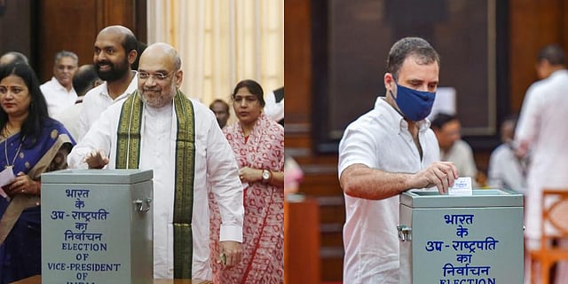 Senior Congress leader Manmohan Singh (L) and PM Modi cast their votes during the Vice Presidential election at Parliament House in New Delhi on August 6, 2022. (Photos | Shekhar Yadav, EPS)Former prime minister Manmohan Singh arrives to cast his vote during the Vice Presidential election at Parliament House in New Delhi on August 6, 2022. (Photo | PTI)Prime Minister Narendra Modi seen during the Vice Presidential election at Parliament House in New Delhi on August 6, 2022. (Photo | PTI)Opposition's Vice Presidential candidate Margaret Alva during the election of the Vice President at Parliament House in New Delhi on August 6, 2022. 80-year-old Alva is a Congress veteran and has served as governor of Rajasthan and Uttarakhand. (Photo | Shekhar Yadav, EPS).L-R: Finance Minister Nirmala Sitharaman with Opposition's Vice Presidential candidate Margaret Alva and NCP's Supriya Sule during the Vice Presidential election at Parliament House in New Delhi on August 6, 2022. (Photo | Shekhar Yadav, EPS).Congress party chief Sonia Gandhi during the Vice Presidential election at Parliament House in New Delhi on August 6, 2022. (Photo | Shekhar Yadav, EPS).Defence Minister Rajnath Singh during the Vice Presidential election at Parliament House in New Delhi on August 6, 2022. (Photo | Shekhar Yadav, EPS).Home Minister Amit Shah casts his vote in the Vice Presidential election at Parliament House in New Delhi on August 6, 2022. (Photo | Shekhar Yadav, EPS).BJP MP Sadhvi Pragya during the Vice Presidential election at Parliament House in New Delhi on August 6, 2022. (Photo | PTI)MP and athlete PT Usha casts her vote in the Vice Presidential election at Parliament House in New Delhi on August 6, 2022. (Photo | PTI)BJP MP and actor Ravi Kishan casts his vote in the Vice Presidential election at Parliament House in New Delhi on August 6, 2022. (Photo | PTI)DMK MP Dayanidhi Maran casts his vote in the Vice Presidential election at Parliament House in New Delhi on August 6, 2022. (Photo | PTI)AAP MP and cricketer Harbhajan Singh casts his vote in the Vice Presidential election at Parliament House in New Delhi on August 6, 2022. (Photo | PTI)DMK MP Kanimozhi and Congress MP Karti Chidambaram are seen during the Vice Presidential election at Parliament House in New Delhi on August 6, 2022. (Photo | PTI)BJP MP and actor Hema Malini casts her vote in the Vice Presidential election at Parliament House in New Delhi on August 6, 2022. (Photo | PTI)Union Minister Smriti Irani casts her vote in the Vice Presidential election at Parliament House in New Delhi on August 6, 2022. (Photo | PTI)Finance Minister Nirmala Sitharaman casts her vote in the Vice Presidential election at Parliament House in New Delhi on August 6, 2022. (Photo | PTI)Congress MP Shashi Tharoor casts his vote in the Vice Presidential election at Parliament House in New Delhi on August 6, 2022. (Photo | PTI)Congress MP Rahul Gandhi casts his vote in the Vice Presidential election at Parliament House in New Delhi on August 6, 2022. (Photo | PTI)Union Minister Arjun Ram Meghwal and Samajwadi Party MP Jaya Bachchan seen during the Vice Presidential election at Parliament House in New Delhi on August 6, 2022. (Photo | PTI)(L-R): Union Ministers Anupriya Patel (third from left), Darshana Jardosh (second from left), and Sadhvi Niranjan Jyoti (extreme right) along with other MPs seen during the Vice Presidential election at Parliament House in New Delhi on August 6, 2022. (Photo | PTI)DMK MP Tiruchi Siva (second from right) and others seen during the Vice Presidential election at Parliament House in New Delhi on August 6, 2022. (Photo | PTI)