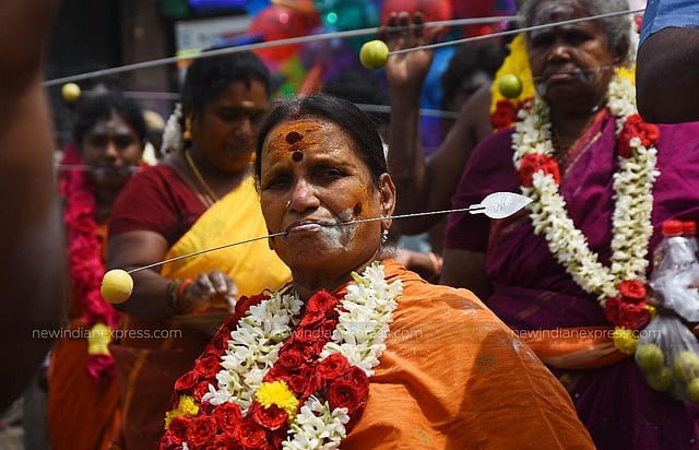 Lord Muruga was born under the Karthigai Nakshatra (star). Devotees of Lord Muruga consider Krithigai to be propitious.It is believed that Lord Shiva, father of Lord Muruga, promised all his devotees that the wishes of his devotees would become fruitful if they worship Lord Muruga on the special days of Krithigai.Worship of Lord Muruga has gained a prominent place, especially among the Tamils, living across the globe.A devotee is seen after having his tongue pierced during Krithigai at Thiruvaleeshwarar temple in Chennai. (Photo | Ashwin Prasath, EPS)Devotees get their body pierced and perform rituals at Thiruvaleeshwarar temple in Chennai on the occasssion of Thai Kiruthigai on Wednesday. (Photo | Ashwin Prasath, EPS)Men with metal hooks attached to their back, pulls coconuts at Thiruvaleeshwarar temple in Chennai on the occasssion of Thai Kiruthigai on Wednesday. (Photo | Ashwin Prasath, EPS)The entire month of Thai is filled with enormous celebrations. The devotees believe Lord Muruga will protect the lives of his devotees and help them to reach newer horizons of success.