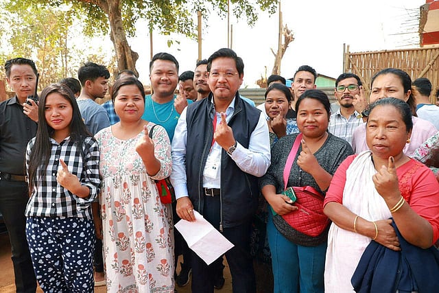 Chief Minister Conrad K Sangma is contesting from the South Tura constituency, where he is pitted against militant-turned-politician Bernard Marak. The ruling National People's Party is fighting to retain power while the BJP, the Trinamool Congress and other regional parties are vying to bring about a change in government in Meghalaya. (Photo | PTI)Former minister and National Peoples Party candidate Mazel Ampareen Lyngdoh after casting her vote at a polling booth during the Meghalaya Assembly elections, in Laitumkhrah in Meghalaya, on Monday, Feb. 27, 2023. (Photo | PTI)An all-women polling Team accompanied by security personnel seen during the Meghalaya Assembly elections, in East Khasi Hills. (Photo | PTI)Women polling team members seen ahead of Nagaland Assembly elections at the DC's Office, in Kohima, on Feb. 26, 2023. (Photo | PTI)Polling officials seen ahead of the Meghalaya Assembly elections, at Nongpoh in Ri Bhoi district, on Feb. 26, 2023. (Photo | PTI)Voters wait to cast their votes at the sole temporary polling station set up at a Leprosy centre in Nongpoh for 309 voters for the Meghalaya Assembly election 2023, in Ri Bhoi on Monday. (Photo | ANI)Meghalaya polling parties leave for their respective polling stations through the living root bridge in Nongria, Sohra. (Photo | PTI)A tenuous ceasefire prevails in Nagaland for more than a decade now as peace talks are continuing with NSCN (IM) and other groups and the central government. (Photo | ANI)In Nagaland, voting was largely peaceful, however, stone pelting and blank firing caused tension in the Bhandari assembly constituency in Wokha district. (Photo | ANI)Of the 60 Assembly constituencies in Meghalaya, 36 constituencies fall in Khasi, Jaintia Hills region while 24 are in Garo Hills region. (Photo | PTI)In Meghalaya, polling could not be held in Sohiong Assembly Constituency in East Khasi Hills district of Meghalaya, following the death of United Democratic Party (UDP) candidate, H. Donkupar Roy Lyngdoh. (Photo | ANI)In Meghalaya, thirty-six of the 369 candidates are women, with the largest number of 10 being fielded by the Congress. (Photo | PTI)Of the total 3,419 polling stations in Meghalaya, 120 are all women-managed polling stations. (Photo | PTI)Counting of votes from Monday's election for these two states will happen on March 2 along with Tripura's. PTI)