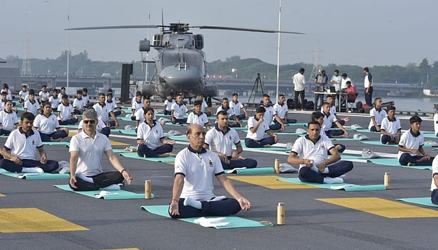 Defence Minister Rajnath Singh participates in yoga onboard aircraft carrier INS Vikrant as part of International Yoga Day in Kochi on Wednesday. Yoga was the mantra on Wednesday as millions across India breathed in and out - mindfully - and twisted and turned to celebrate the International Day of Yoga. (Photo | A Sanesh, EPS)