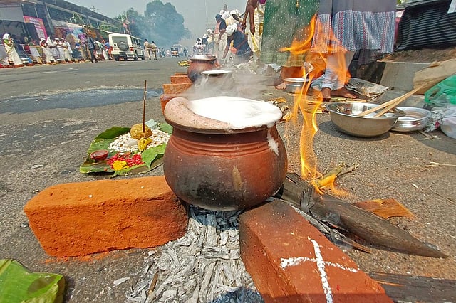 As per local legend, the annual festival commemorates the hospitality accorded by women in the locality to Kannagi, the divine incarnation of the heroine of Tamil epic 'Silappadhikaram' while she was on her way to avenge the injustice meted out to her husband Kovalan, after destroying Madurai city. (Photo | B P Deepu, EPS)During the past two years, devotees participated in the ritual by offering pongala at their homes due to the Covid situation. (Photo | B P Deepu, EPS)The rituals began at the Attukal Devi temple when the temple tantri Thekkedath Parameswaran Vasudevan Bhattathirippad handed over a lighted lamp to the melsanthi P Kesavan Namboodiri at the sanctum sanctorum. After this, housands of women, including transwomen, devotees lit their makeshift brick stoves and began preparing the 'pongala' or sweet delicacies like 'payasam' and 'therali'. (Photo | B P Deepu, EPS)Pongala is the sweet porridge considered to be the favourite of the goddess of the Attukal Devi temple. The 'pongala' -- a mix of rice, jaggery and scraped coconut -- or various other kinds of sweet delicacies were prepared in fresh earthen or metal pots. (Photo | B P Deepu, EPS)Incidentally, this year's festival comes on the eve of International Women's Day, which falls on March 8. (Photo | B P Deepu, EPS)Several rows of brick hearths were lined up around the Attukal Bhagavathy temple here with many women, cutting across age barriers, wearing white hats or covering their heads to beat the extreme heat as they prepared offerings for the presiding deity of the shrine. (Photo | B P Deepu, EPS)The pongala festival marks the finale of the 10-day ritual at the shrine. Preparing 'pongala' is considered an auspicious all-women ritual as part of the annual festival of the Attukal temple, popularly known as the 'Women's Sabarimala'. (Photo | B P Deepu, EPS)