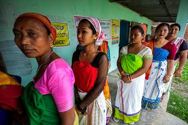 Deori tribal women stand in a queue to cast their vote during the first round of polling of India's national election in Jorhat, Assam. (Photo | AP)
