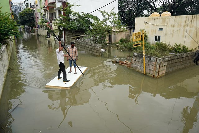 Residents shifting a two-wheeler from the flooded area in Sai layout, Bengaluru.