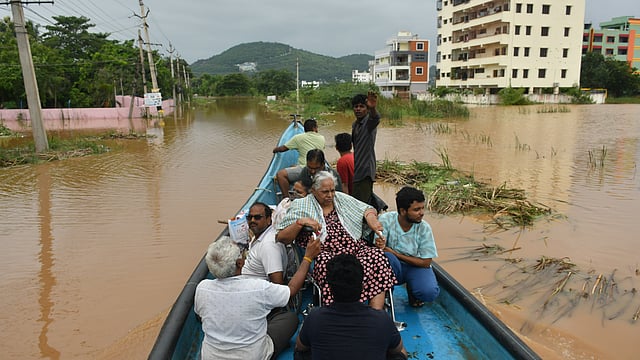 As the flood waters in Vijayawada reached a critical level, dozens of residents, including elderly people and young children, were left stranded for nearly 24 hours as water levels surged to nearly 10 feet in Ambapuram. (Photo | Prasant Madugula, EPS)