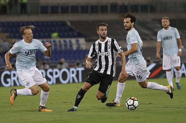 Juventus' Miralem Panic, center, dribbles past Lazio's Lucas Leiva, left, and Lazio's Marco Parolo during the Italian Super Cup final match between Lazio and Juventus at Rome's Olympic stadium. | AP