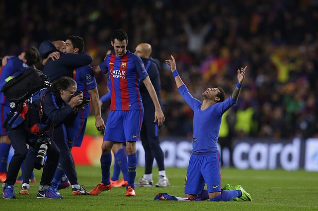 Barcelona's coach Luis Enrique celebrates with Barcelona's Brazilian forward Neymar their 6-1 victory at the end of the UEFA Champions League round of 16. AFPBarcelona's Lionel Messi scores a penalty past PSG goalkeeper Kevin Trapp during the Champions League round of 16. APBarcelona's Lionel Messi, celebrates scoring his side's 2nd goal from a penalty during the Champions League round of 16. APBarcelona's Sergi Roberto celebrates after scoring the sixth goal during the Champions League round of 16. APBarcelona's Lionel Messi celebrates with Neymar their victory during the Champion League round of 16, second leg soccer match against Paris Saint Germain at the Camp Nou stadium. APBarcelona players celebrate at the end of the Champions League round of 16. APBarcelona's coach Luis Enrique celebrates with Barcelona's Argentinian forward Lionel Messi (L) beside the rest of their team at the end of the UEFA Champions League round of 16 second leg football match FC Barcelona vs Paris Saint-Germain FC. AFP