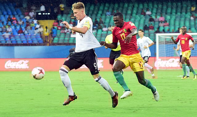 In the eighth minute, Arp took Germany ahead. Capitalising on a defensive lapse, Dennis Jastrzembski set up his captain in the centre of the box, and the latter easily slotted into the left corner. | Express Photo ServiceThe goal was followed up with some quick raids and it appeared as if the Germans would have a walk in the park. But that was not to be. After their initial scruple, the Africans came back strongly. | Express Photo ServiceIn the 26th minute, Soumah pulled one back through a scorching left-footer. The momentum of the game settled into an equilibrium after, as both teams launched a few good moves. | Express Photo ServiceGuinea's 14-year-old talismanic striker Fendje Toure was slightly off-colour in the first half, but his partner Doss Soumah and overlapping defender Ibrahima Soumah put the pressure back on the Germans. | Express Photo ServiceGuinea had their moments too. Toure --who regained his touch later-- and Seydouba Cisse had couple of chances, but failed to provide the finishing touch, as Germany scored two more to end the match 3-1 in their favour. | Express Photo ServicePlayers of Brazil celebrating a goal against Niger during the U-17 FIFA World Cup match at Fatorda in Goa on Friday. The tournament favourites lived up to their billing as they scored a convincing 2-0 victory over Niger to top Group D. | PTIThe three-times champions, who enjoyed possession against a spirited Niger outfit, scored through Lincoln (4th minute) and Brenner (34th). | PTIDebutants Niger gave a good account of themselves and performed better in the second half and had their share of chances, but found the rival keeper Gabriel Brazao a hard nut to crack. | PTIMohamed Moukhliss and Cesar Gelabert struck a goal each as European champions Spain secured a ticket to the Round of 16 with a comfortable 2-0 win over North Korea in Kochi's Jawharlal Nehru Stadium. | Express Photo ServiceMoukhliss opened the scoring as early as in the fourth minute, while Gelabert doubled the lead by striking one in the 71st minute. | Express Photo ServiceSpain finished the league engagements in Group D in second position with six points behind leaders Brazil. Spain lost to Brazil in their tournament opener, but bounced back with a 4-0 rout of Niger. | Express Photo ServiceSpain had no trouble against their opponents from Korea, and the match went on expected lines. With this result, North Korea bow out of the tournament without a win. | Express Photo ServiceThe first goal came when Moukhliss shot one from the centre of the box off an assist by Gelabert. The Spanish dominated the game and had the lion's share of possession throughout. Gelabert added the second goal in the second half, as his right-footed shot from a very close range found the back of the net. | Express Photo Service