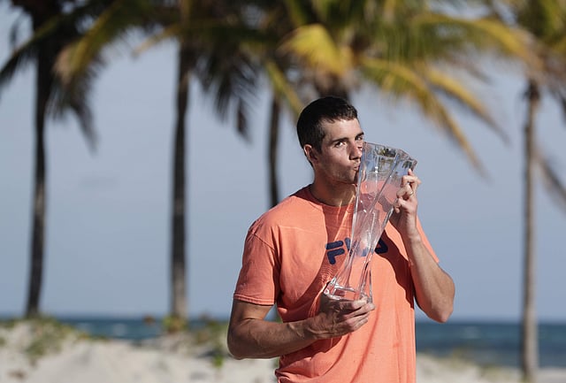 John Isner poses with his trophy on Crandon Park Beach, after defeating Alexander Zverev in the men's final at the Miami Open. | AP