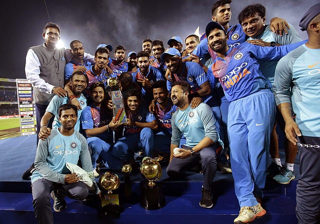 Dinesh Karthik did a Javed Miandad with a last-ball six as India pulled off an incredible chase beating Bangladesh by four wickets in the Nidahas T20 Tri-series final on Sunday. IN PIC: The victorious Indian side with the Nidahas Trophy. (Photo | AP)