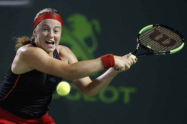 Jelena Ostapenko returns a shot from Danielle Collins during a semifinal at the Miami Open. | AP