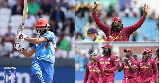 Chris Gayle, playing his last World Cup game departed early | APEvin Lewis and Shai Hope kept things in control with a 88 run partnership | APShai Hope top-scored with 77 and later won the Man of the Match award | APAfghanistan spinners kept the Windies batsmen quiet in the middle overs | APJason Holder and Nicholas Pooran finished off brilliantly with a century-plus stand | APPooran's quick half-century helped Windies go past 300 | APAfghanistan batsmen Rahmat Shah and Ikram Ali kept their team in the hunt with a 133-run partnership for the second wicket | APIkram Ali missed out on being the only teenage centurion at the World Cup by 14 runs | APKemar Roach's economical three-wicket burst made sure Windies tasted consolation victory | AP
