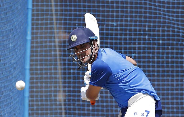 MS Dhoni bats in the nets during a training session ahead of their third ODI match against Australia in Ranchi. | AP