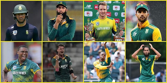 Faf du Plessis: (C) 34 years, RH Bat (Photo | AP)Hashim Amla: 36 years, RH Bat (Photo | Twitter/@ICC)Quinton de Kock: 26 years, WK, LH Bat (Photo | AFP)David Miller: 29 years, LH Bat (Photo | AFP)Aiden Markram: 24 years, RH Bat (Photo | AFP)Rassie van der Dussen: 30 years, RH Bat (Photo | AFP)JP Duminy: 35 years, LH Bat, Right-arm offbreak (Photo | AP)Andile Phehlukwayo: 23 years, LH Bat, Right-arm medium (Photo | AFP)Dwaine Pretorius: 30 years, RH Bat, Right-arm medium (Photo | AFP)Chris Morris: 32 years, RH bat, Right-arm medium (Photo | AP)Dale Steyn: 35 years, Right-arm fast (Photo | AP)Lungi Ngidi: 23 years, Right-arm fast (Photo | AFP)Kagiso Rabada: 23 years, Right-arm fast (Photo | AFP)Tabraiz Shamsi: 29 years, Left-arm chinaman (Photo | AP)Imran Tahir: 40 years, Right-arm legbreak (Photo | AFP)
