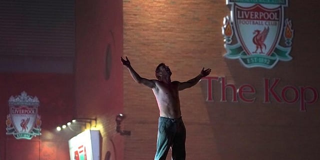 Liverpool fans ignored social distancing rules to gather outside Anfield in celebration of their team's first English title in 30 years on Thursday. (Photo | AP)