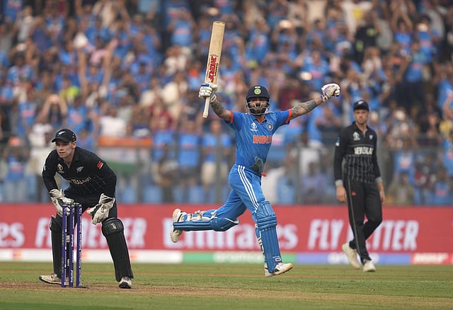 Kohli raised his arms aloft then sank to his knees and bowed to the fans with his helmet off after reaching three figures in the semifinal match against New Zealand at the Wankhede stadium. (Photo | AP)He was 100 not out after facing 106 balls in a virtually chanceless innings to that point. (Photo | AP)The 50-year-old Tendulkar, the highest run-scorer in ODI and test cricket, was in the crowd in Mumbai to see the latest landmark reached by Kohli, who was eventually dismissed for 117 and applauded off the field by India's fans. (Photo | AP)Spectators cheer as Virat Kohli walks back to the pavilion after losing his wicket and scoring a century during the ICC Men's Cricket World Cup first semi-final match between India and New Zealand in Mumbai. (Photo | AP)Virat Kohli gets a standing ovation from teammates as he arrives back to the dressing room after losing his wicket during the ICC Men's Cricket World Cup first semifinal match between India and New Zealand in Mumbai. (Photo | AP)