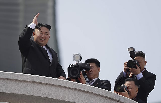 North Korean leader Kim Jong Un waves during a military parade on Saturday, April 15, 2017, in Pyongyang, North Korea to celebrate the 105th birth anniversary of Kim Il Sung, the country's late founder and grandfather of current ruler Kim Jong Un. | AP