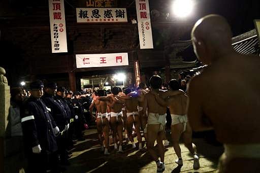 Worshippers arrive at Saidaiji Temple to attend the annual Naked Man Festival or 'Hadaka Matsuri' in Okayama, western Japan. (AFP)