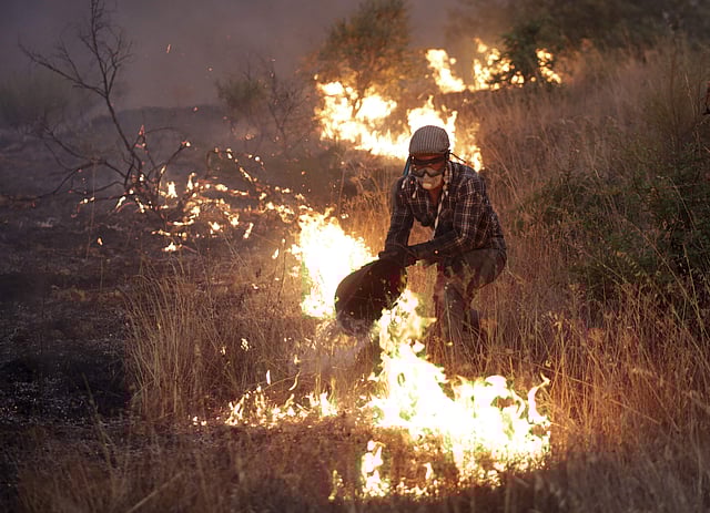 A man uses a bucket to fight a fire in a field outside the village of Sao Jose das Matas, near Macao, central Portugal. More than 2,300 firefighters with more than 700 vehicles are tackling wildfires in Portugal, where every summer large areas of woodland