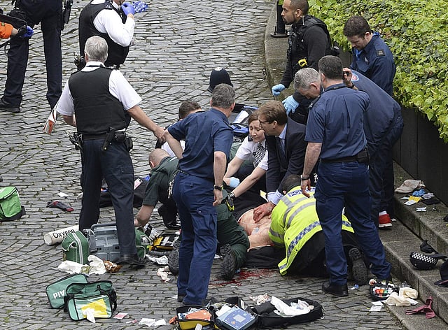 Conservative Member of Parliament Tobias Ellwood, centre, helps emergency services attend to an injured person outside the Houses of Parliament, London, Wednesday, March 22, 2017. | AP