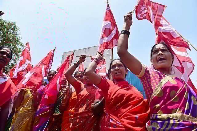 Members of various trade unions take part in a rally to mark the International Labour Day also known as May Day in Bengaluru on Monday. (PTI)