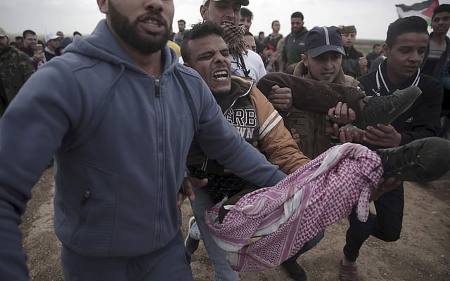 Palestinian protesters carry a wounded man who was shot by Israeli troops during a demonstration near the Gaza Strip border with Israel in eastern Gaza City. | AP