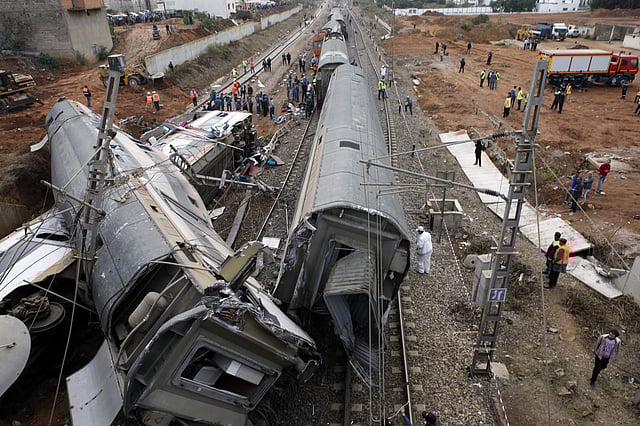 National railway company boss Mohamed Rabie Khlie earlier gave a death toll of six, including the driver and his assistant, and said 86 people were injured. (Photo | AFP)A short statement from the ONCF national railway company said 'an investigation has been opened to determine the causes of the accident' and pledged to provide more information when it had it. (Photo | AFP)The shuttle train linking Rabat to the town of Kenitra derailed about halfway between the two, in the town of Sidi Bouknadel, near the city of Sale. (Photo | AFP)Sale Deputy Mayor Abdellatif Soudou said rescue workers were searching for passengers who might be trapped in the twisted wreckage of the train. Dozens were injured in the derailment, Soudou said. (Photo | AFP)An AFP photographer saw rescue teams work to retrieve bodies from the overturned train after its carriages had toppled across the tracks.Railway boss Khlie said that such deadly accidents were rare in the North African country, pointing to a crash in 1993 that killed 15 people as 'the last one'. (Photo | AFP)The Moroccan king, Mohammed VI, offered to pay the costs of the victims' funerals out of his own pocket, MAP reported. (Photo | AFP)