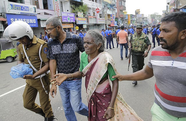 An elderly woman is helped near St. Anthony's Shrine after a blast in Colombo, Sri Lanka. (Photo | AP)