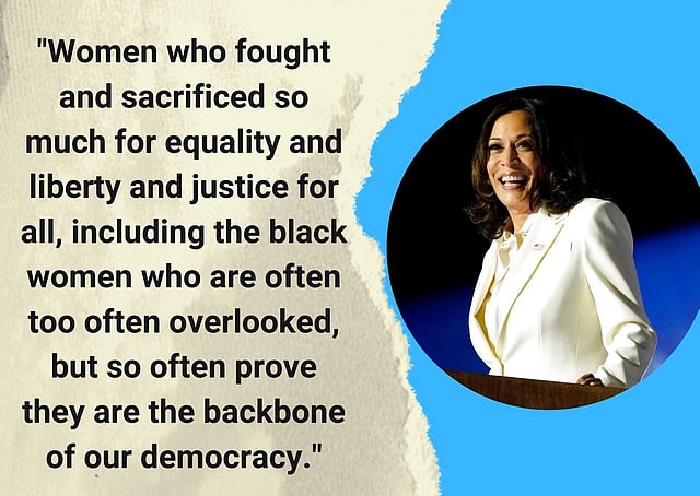 'When she (her mother) came here from India at the age of 19. She maybe didn't quite imagine this moment. But she believed so deeply, and in America, where a moment like this is possible. And so I'm thinking about her, and about the generations of women, black women, Asian, white, Latina Native American women who throughout our nation's history have paved the way for this moment tonight.' (Photo | AP)Tonight I reflect on their struggle, their determination and the strength of their vision to see what can be unburdened by what has been. And I stand on their shoulders. (Photo | AP)But while I may be the first woman in this office, I will not be the last. Because every little girl, watching tonight sees that this is a country of possibilities. And to the children of our country, regardless of your gender. Our country has sent you have a clear message: dream with ambition, lead with conviction and see yourselves in a way that others may not simply because they've never seen it before... (Photo | AP)Because now is when the real work begins, the hard work, the necessary work, the good work, the essential work to save lives and beat this epidemic. To rebuild our economy, so it works for working people. To root out systemic racism in our justice system and society. To combat the climate crisis. To unite our country and heal the soul of our nation. (Photo | AP)America's democracy is not guaranteed. It is only as strong as our willingness to fight for it. To guard it, and never take it for granted and protecting our democracy takes struggle. It takes sacrifice. But there is joy in it. And there is progress. Because we the people have the power to build a better future. (Photo | AP)You marched and organised for equality and justice. For our lives, and for our planet. And then you voted. You delivered a clear message. You chose hope, unity, decency, science and yes, truth. (Photo | AP)