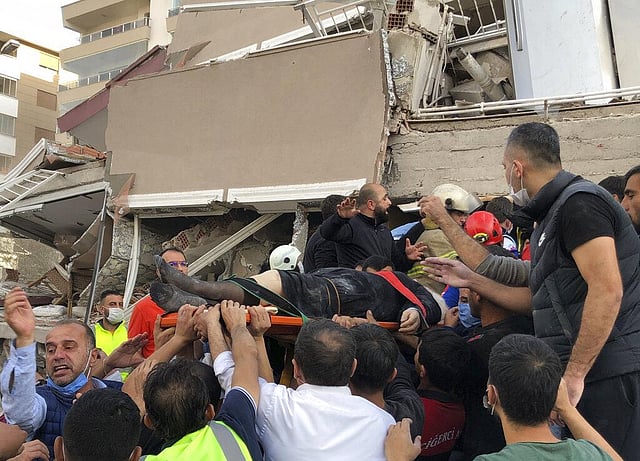 A powerful earthquake hit Turkey and Greece on Friday, killing at least 26 people, levelling buildings and creating a sea surge that flooded streets near the Turkish resort city of Izmir. (Photo | AP)