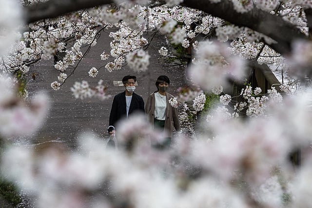 Japan’s favorite flower, called “sakura,' used to reach its peak bloom in April, just as the country celebrates the start of its new school and business year. (Photo | AP)Some say it is the earliest peak bloom ever based on records from historic documents, diaries, and poetry books from Kyoto. (Photo | AP)The trees normally bloom for about two weeks each year from the first bud to all the blossoms falling off. (Photo | AP)Cherry trees are sensitive to temperature changes and the timing of their blooming can provide valuable data for climate change studies. (Photo | AP)Sakura has deeply influenced Japanese culture for centuries and regularly been used in poetry and literature with their fragility seen as a symbol of life, death, and rebirth. (Photo | AP)A man wearing a protective mask to help curb the spread of the coronavirus pauses under cherry blossoms, in Tokyo. (Photo | AP)