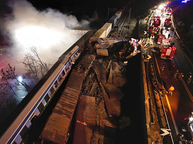 A freight and passenger train collision occurred near Tempe, some 380 kilometers (235 miles) north of Athens. This resulted in the derailment of several train cars and at least three burst into flames. The latter was carrying 350 passengers. (Photo | AP)