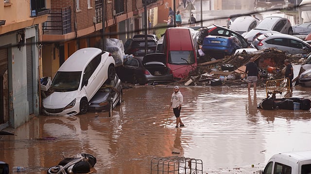 Cars are swept away by the water, after floods preceded by heavy rains caused the river to overflow its banks in the town of Alora, Malaga, Spain.A man walks through flooded streets in Valencia, Spain.