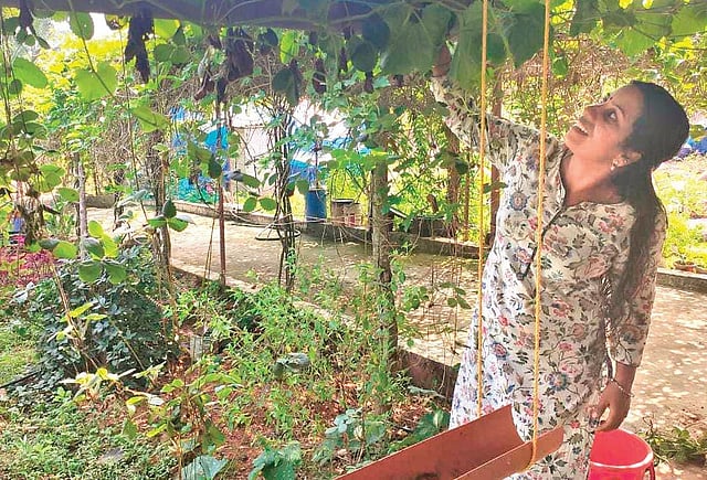 Farmer Sreevidya is introduced by the passion fruit trellis over the long driveway to her house. “Passion fruit helped me a lot in bringing greenery to his place,” she says holding on to low-lying fruits.